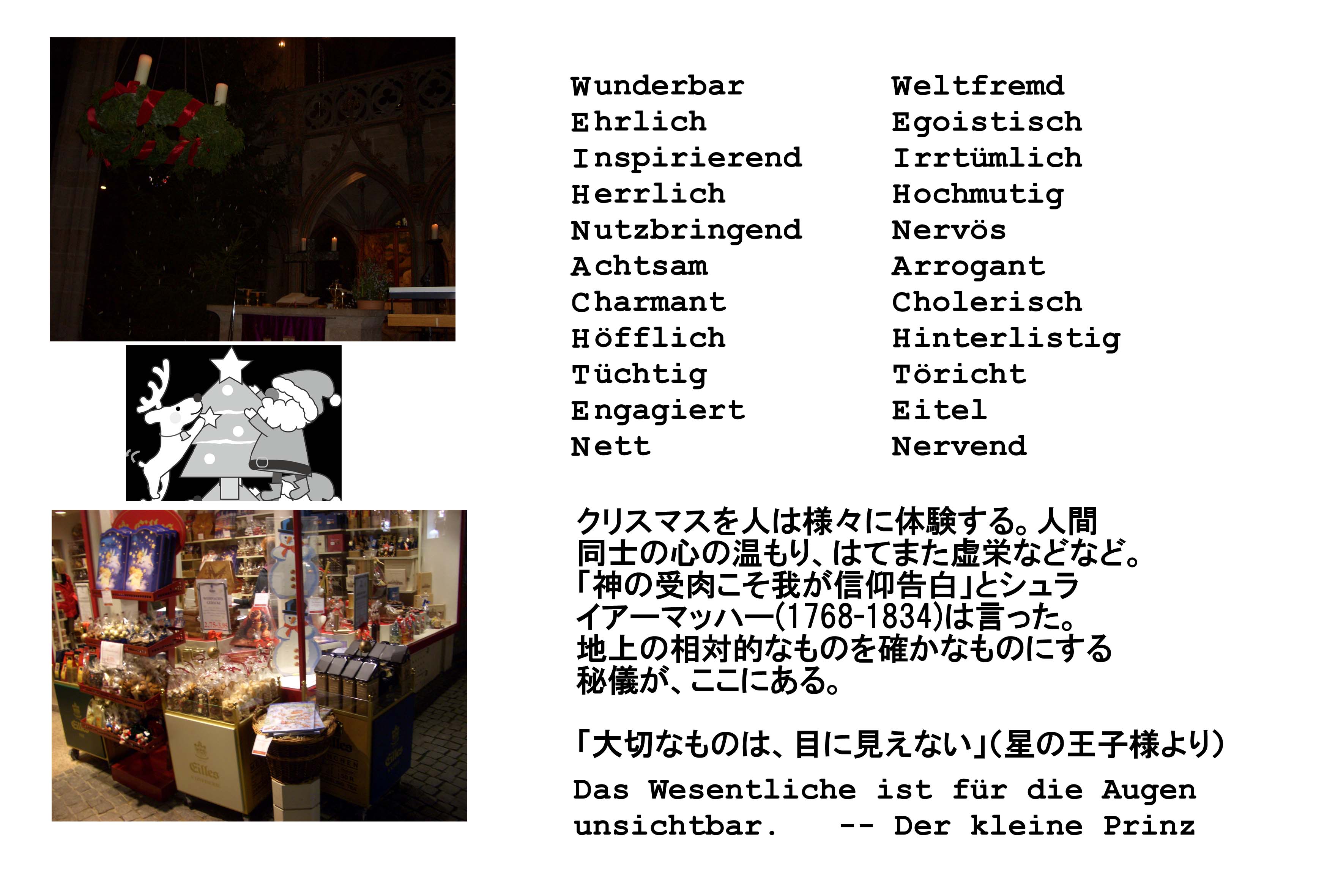 Man erfährt die Weihnacht unterschiedlich; Einerseits befindet sich die Wärme darin, anderseits vielleicht die Eitelkeit. Wenn Schleiermacher (1768-1834) in seiner Predigt sagt, dass incarnatio sein Bekenntnis ist, meinte er damit, dass alle Vergängliches durch die Inkarnation gesichert wird. Daher "L'essentiel est invisible pour les yeux"(Le Petit Prince).